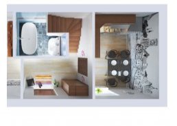 Если детально рассмотреть планировку комнат, то на первом этаже можно найти просторную гостиную, кухню и санузел с холлом. В каждой комнате может находиться порядка четырех человек. Санузел располагает к тому, чтобы установить там стандартную ванную или душевую кабину.